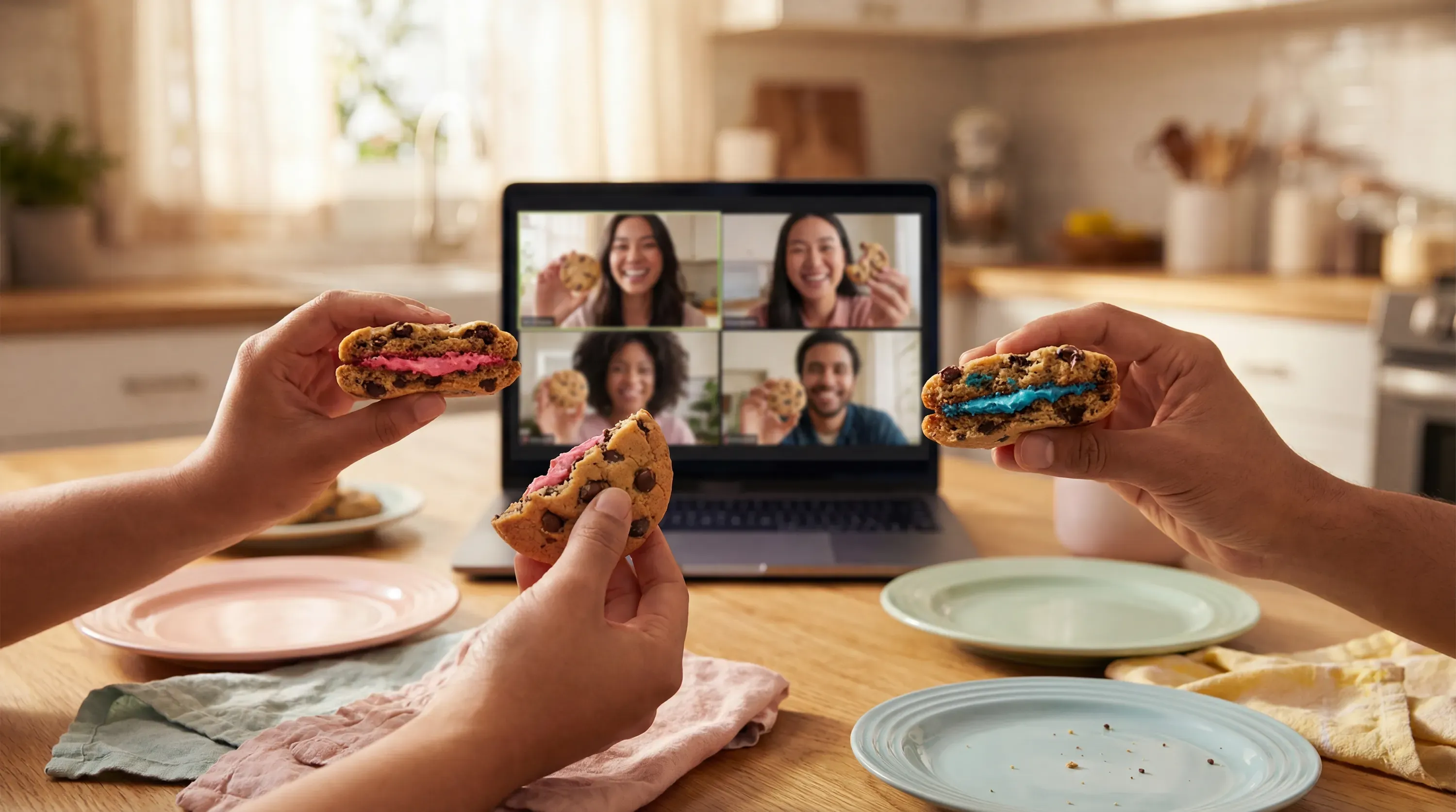 Bake gender reveal cookies with colored filling hidden inside. Ship them to family members with strict instructions not to eat until the designated time. Then everyone bites in together on video.