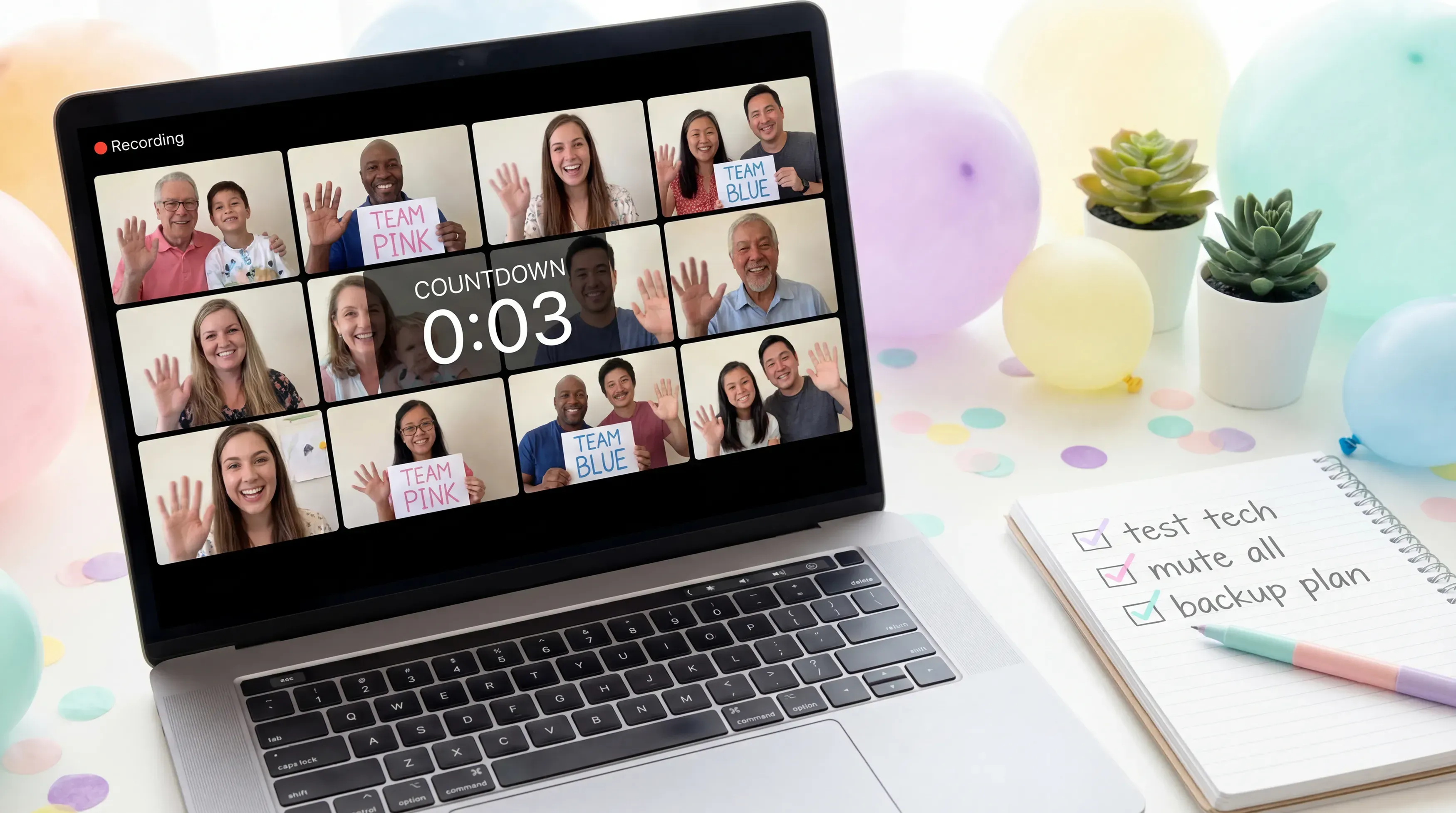 Mute by default. Audio chaos ruins reveals. Ask everyone to mute until the countdown finishes. Then unmute together for the celebration.